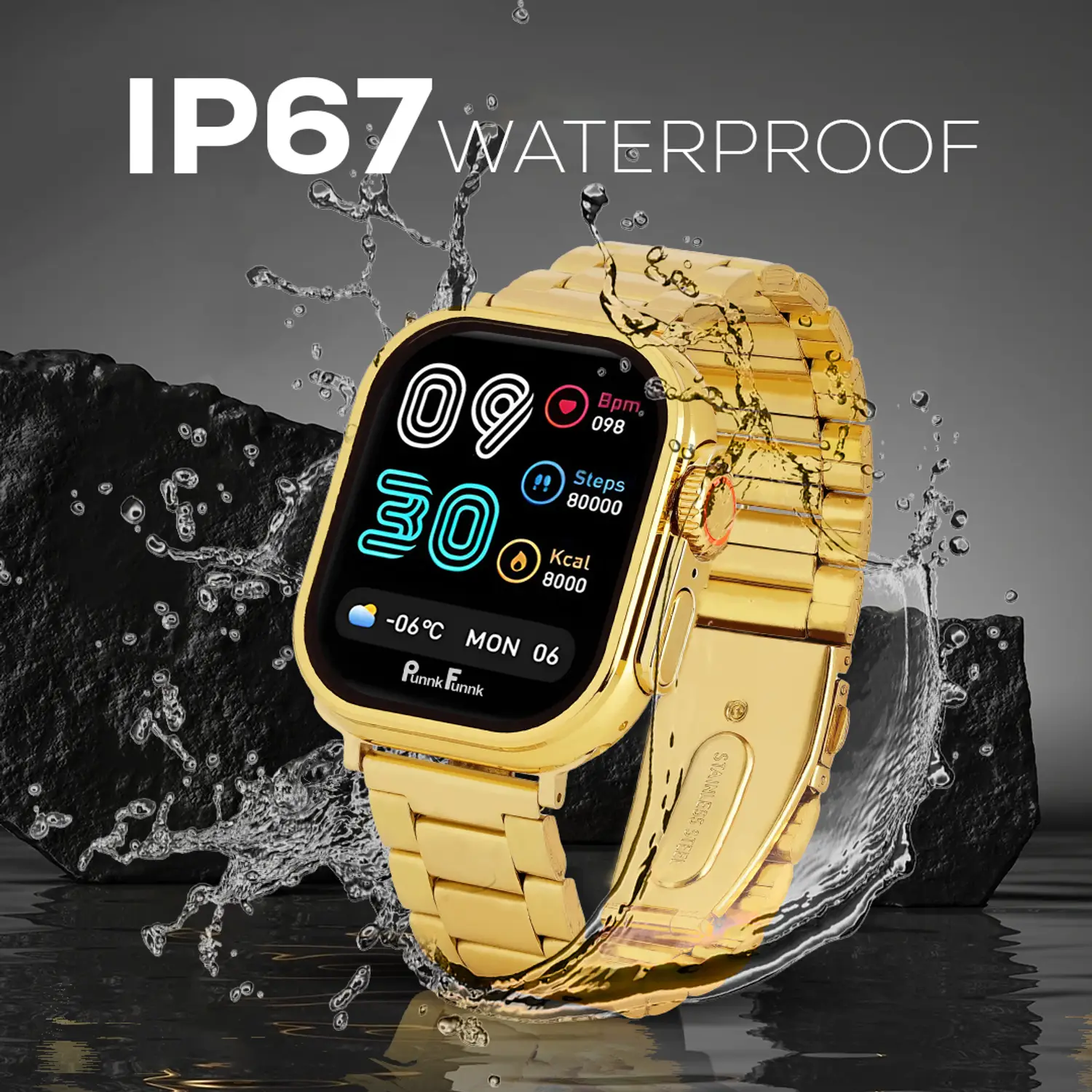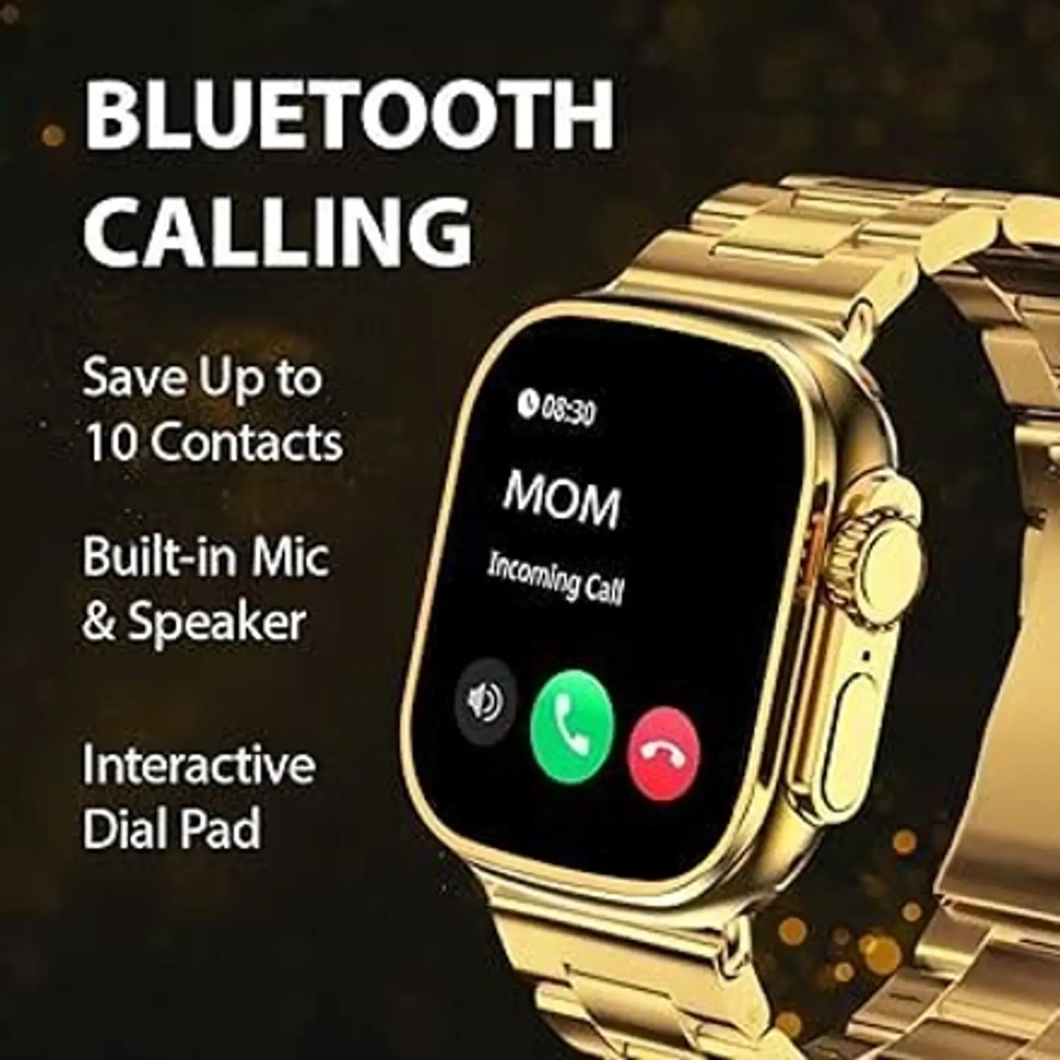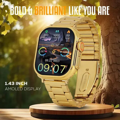ساعة ذكية فاخرة باللون الذهبي مع حزام سيليكون ومعدني – تصميم عصري وميزات رياضية وتقنية متقدمة