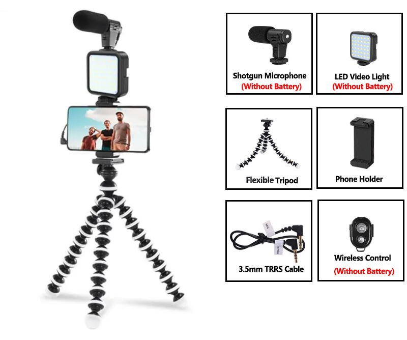 Smartphone Kit avec trépied, support de téléphone, mini microphone, lumière de remplissage LED